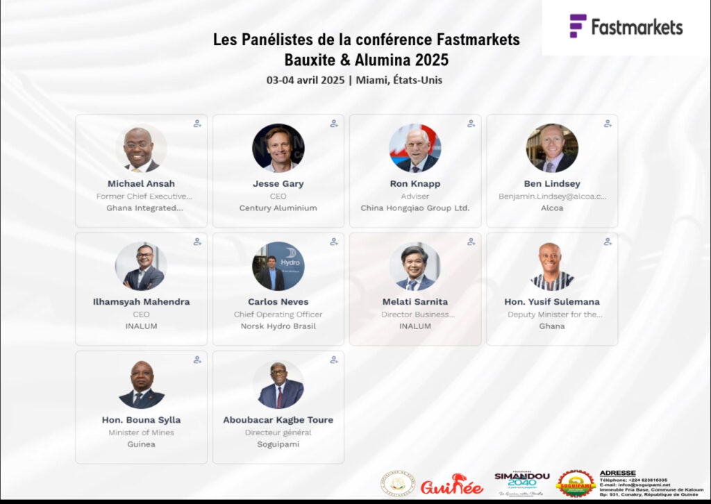 La Société Guinéenne du Patrimoine Minier (SOGUIPAMI) prendra part à la 29e édition de la conférence Fastmarkets Bauxite & Alumina, qui se tiendra du 3 au 4 avril 2025 à Miami, aux États-Unis.